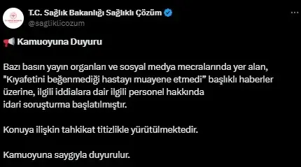 Öte yandan Sıhhat Bakanlığı’ndan da bahse ait bir açıklama yapıldı. Bakanlığın “Sağlıklı Çözüm” isimli resmi toplumsal medya hesabı üzerinden yapılan açıklamada şu sözlere yer verildi: “Bazı basın yayın organları ve toplumsal medya mecralarında yer alan ‘Kıyafetini beğenmediği hastayı muayene etmedi’ başlıklı haberler üzerine, ilgili işçi hakkında idari soruşturma başlatılmıştır. Mevzuya ait tahkikat titizlikle yürütülmektedir.”